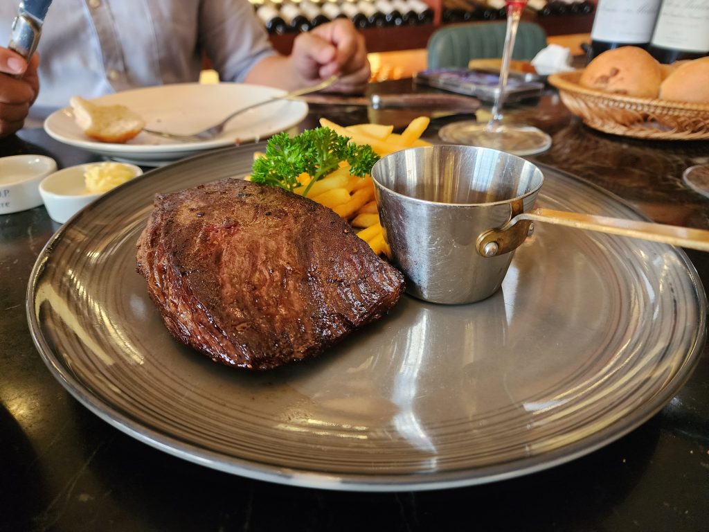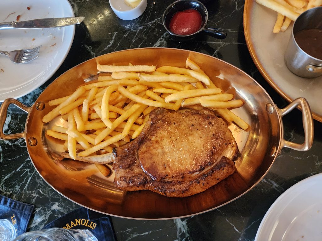 This was followed by a veritable butcher’s block to share, including a large, tender, perfectly cooked Pork Chop, beaming from its copper dish. Glistening, succulent lamb cutlets, and a flank steak with a particularly good sear, cooked deliciously rare; it was juicy, tender, and flavourful.