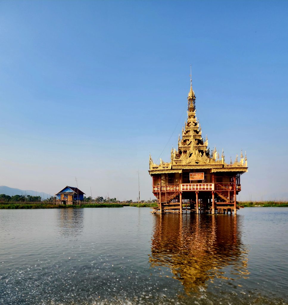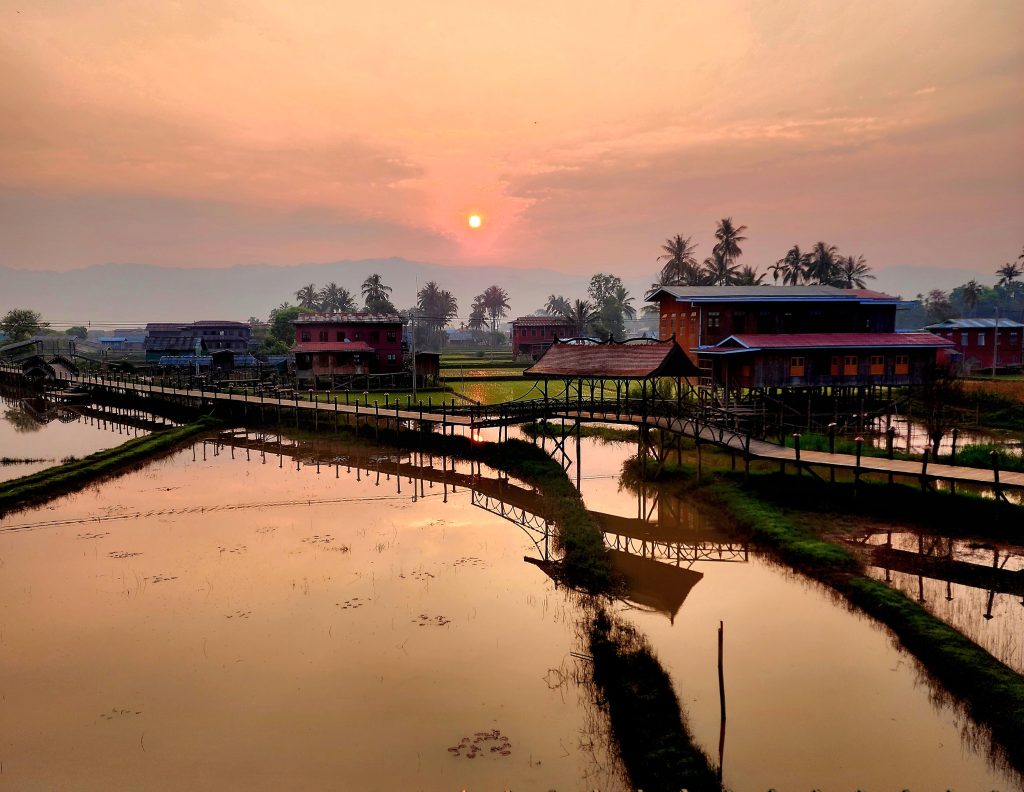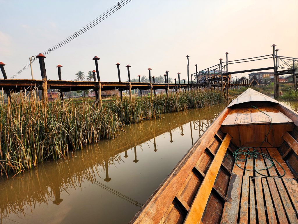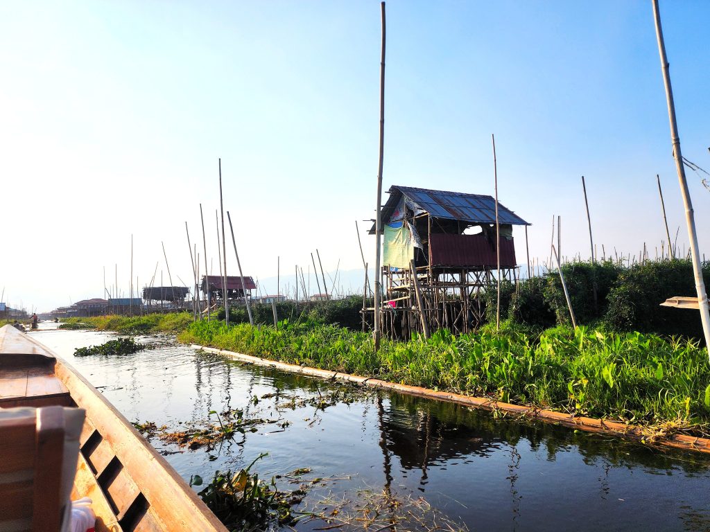 Time stops on the lake, but eventually our narrow little boat turns into a secluded cove, somewhere between Nwadama and Myani Gone villages. At first, we glide between floating gardens, no Babylonian myth, these are some of the most famous floating gardens in the world. The Intha people, “sons of the lake,” have lived on Inle for centuries, developing this unique agriculture to adapt to their water-based environment. The gardens are held in place with the weaving of water hyacinth mats and large bamboo poles; their produce is vital for survival.