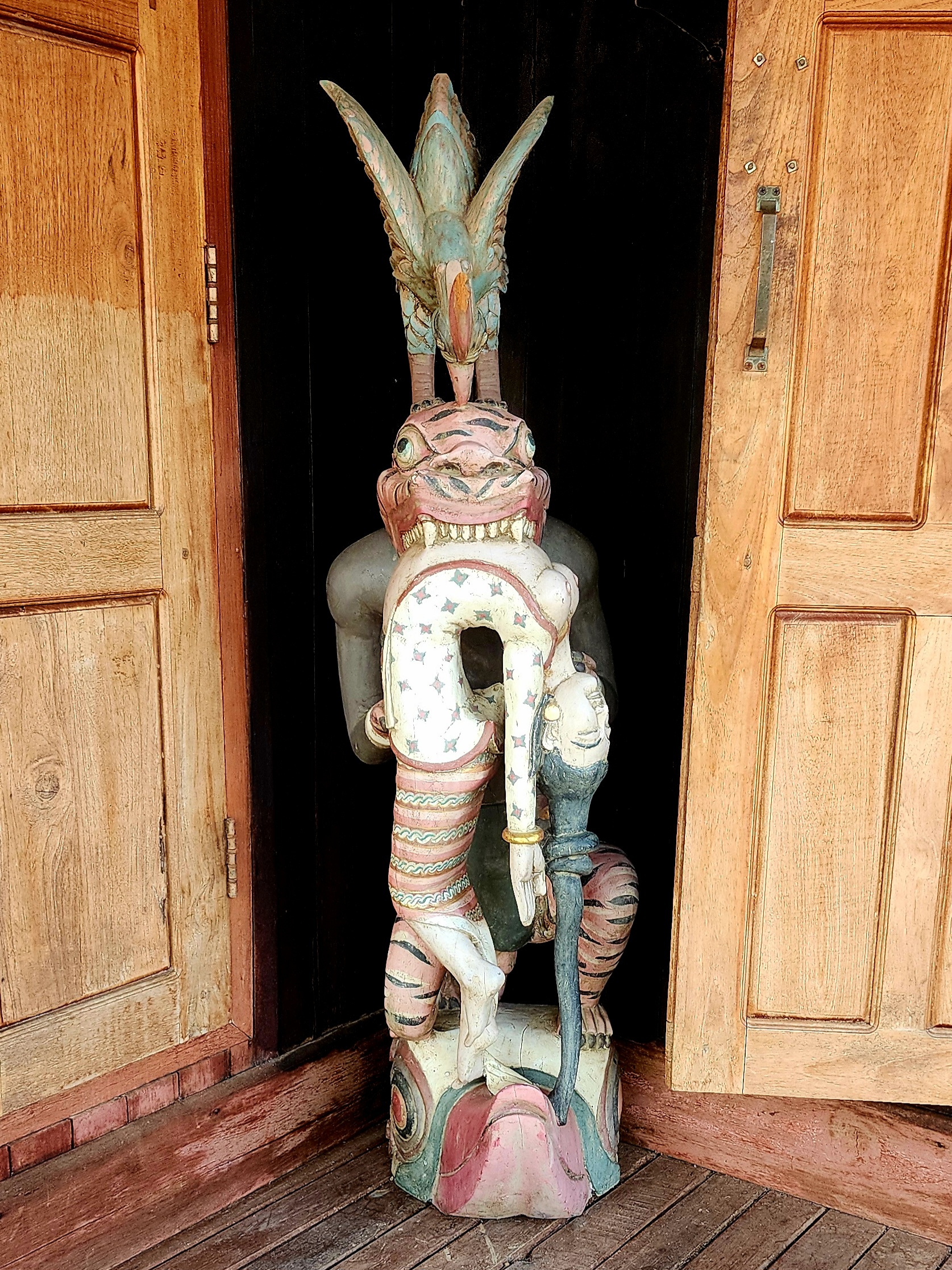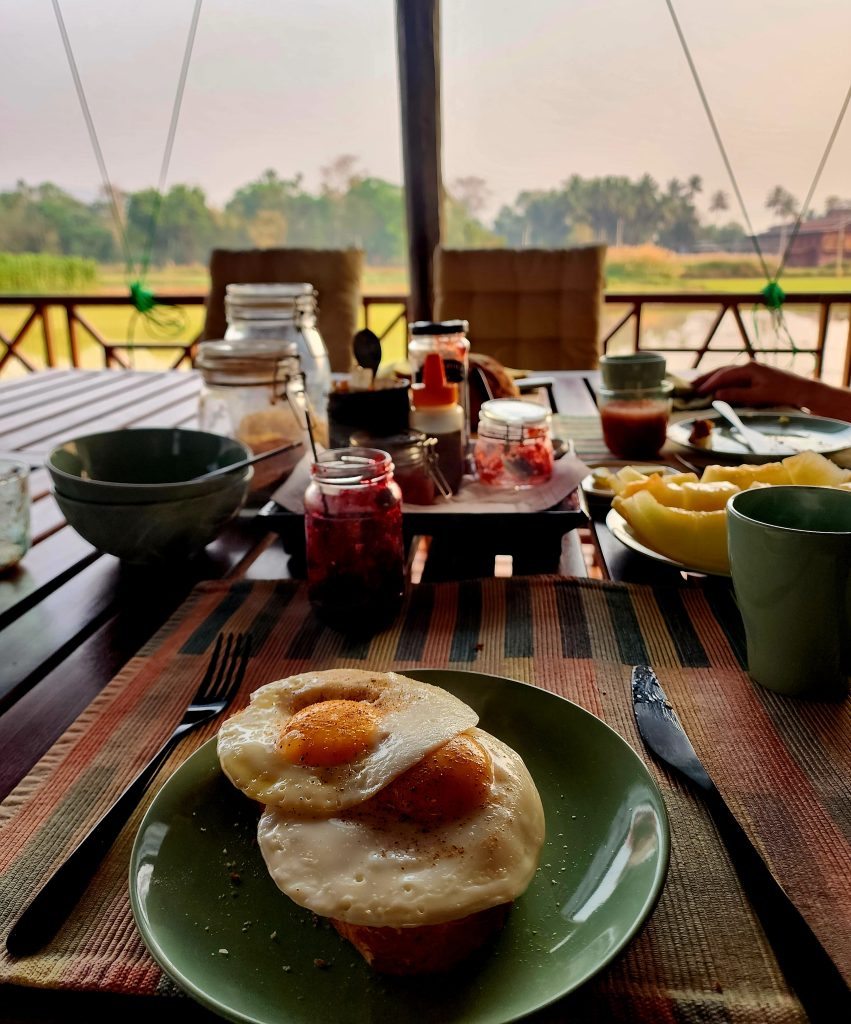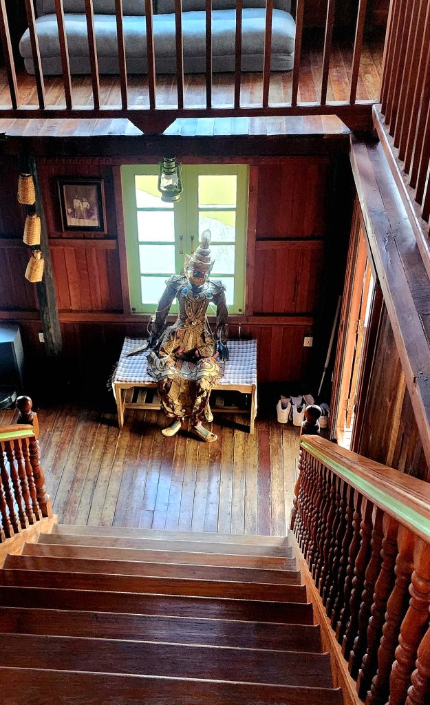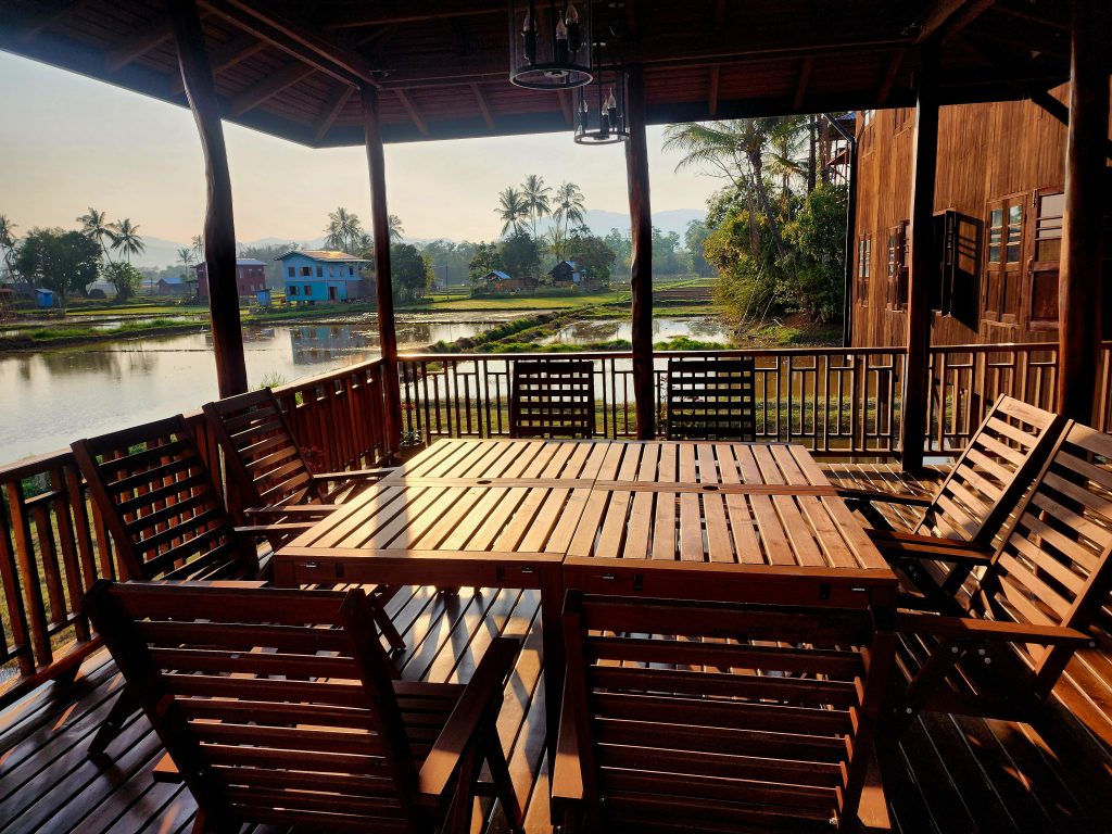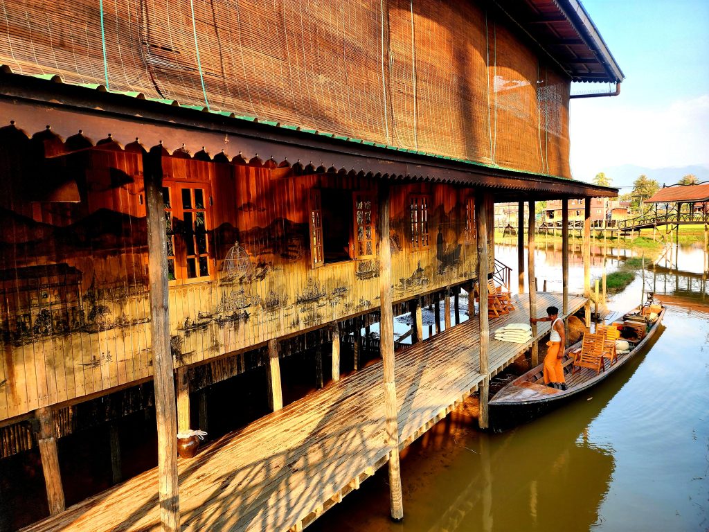 A boardwalk on stilts connects you to a series of large, renovated, immaculate wooden houses and buildings on stilts over the lake, some set aside for artists and writers, one an old hand-rolled cheroot factory, one now a large restaurant. Behind the property, large wet-rice fields are hand-tended with the aid of buffalo. Across the field is an impossibly large Buddhist temple on stilts. Beyond that, the lakeshore is lined with large palms and jungle greenery.