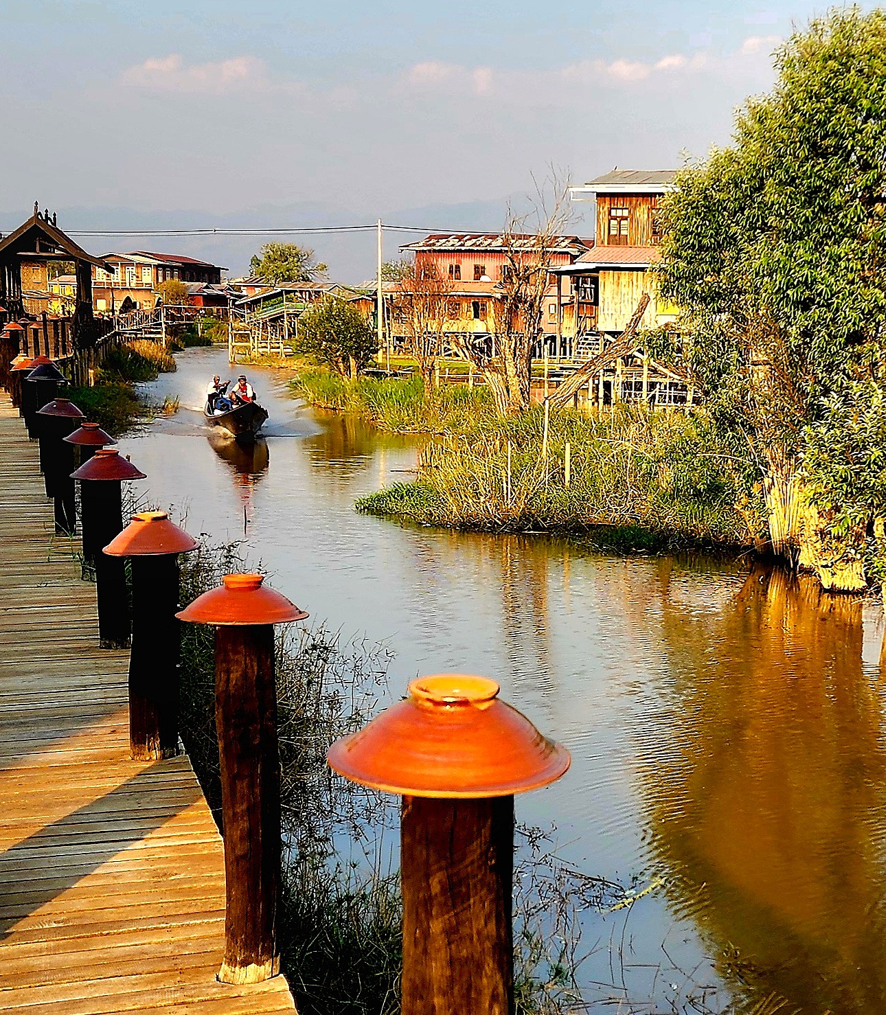 Soon, we find ourselves passing through a village of stilt houses, some small, some surprisingly large. The canal we are on becomes busy with boat traffic, men returning from tending their gardens or fishing for dinner, women returning from floating markets, and small children in little paddle boats. I think to myself that it is like an eastern version of a Venetian canal at peak hour!